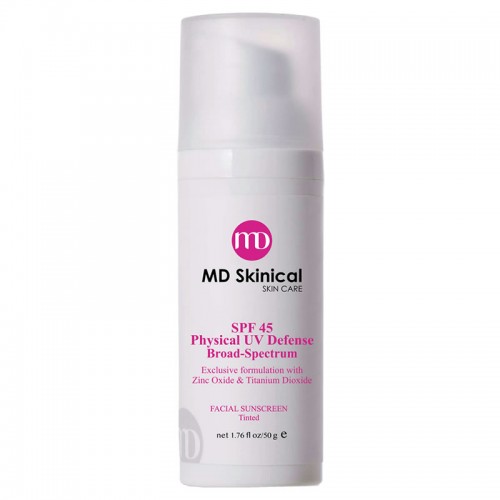 MD Skinical推出的高效物理性防曬霜SPF 45(有色),有效防UVA及UVB之有效防曬成分,採用物理性防曬,不會容易引起敏感,比其他防曬產品更溫和。